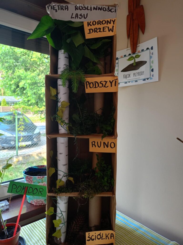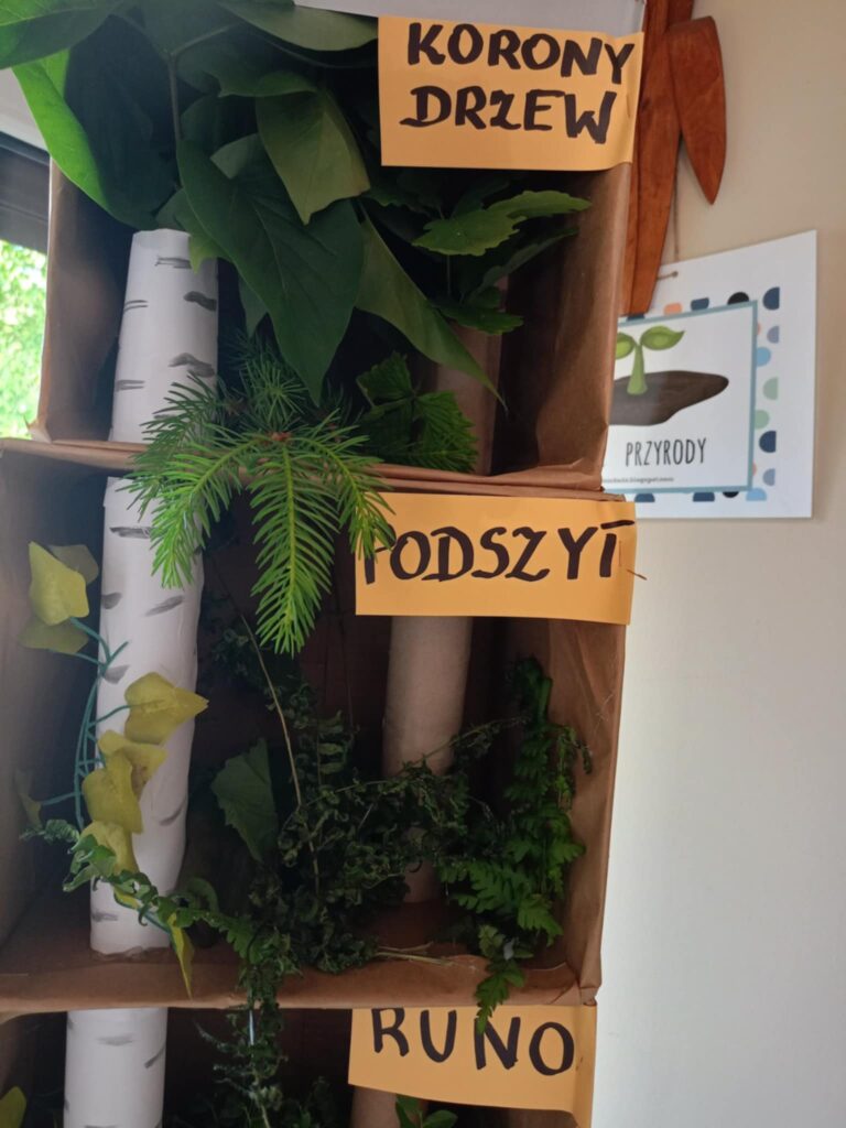 Nasz kącik przyrodniczy właśnie zyskał wyjątkowe wzbogacenie! Po inspirującej wycieczce do lasu postanowiliśmy przenieść jego atmosferę do naszej świetlicy. Spacer był okazją do przypomnienia sobie, jak zbudowany jest las – od ściółki, przez podszyt, aż po korony drzew – i jakie organizmy zamieszkują każde z tych pięter.