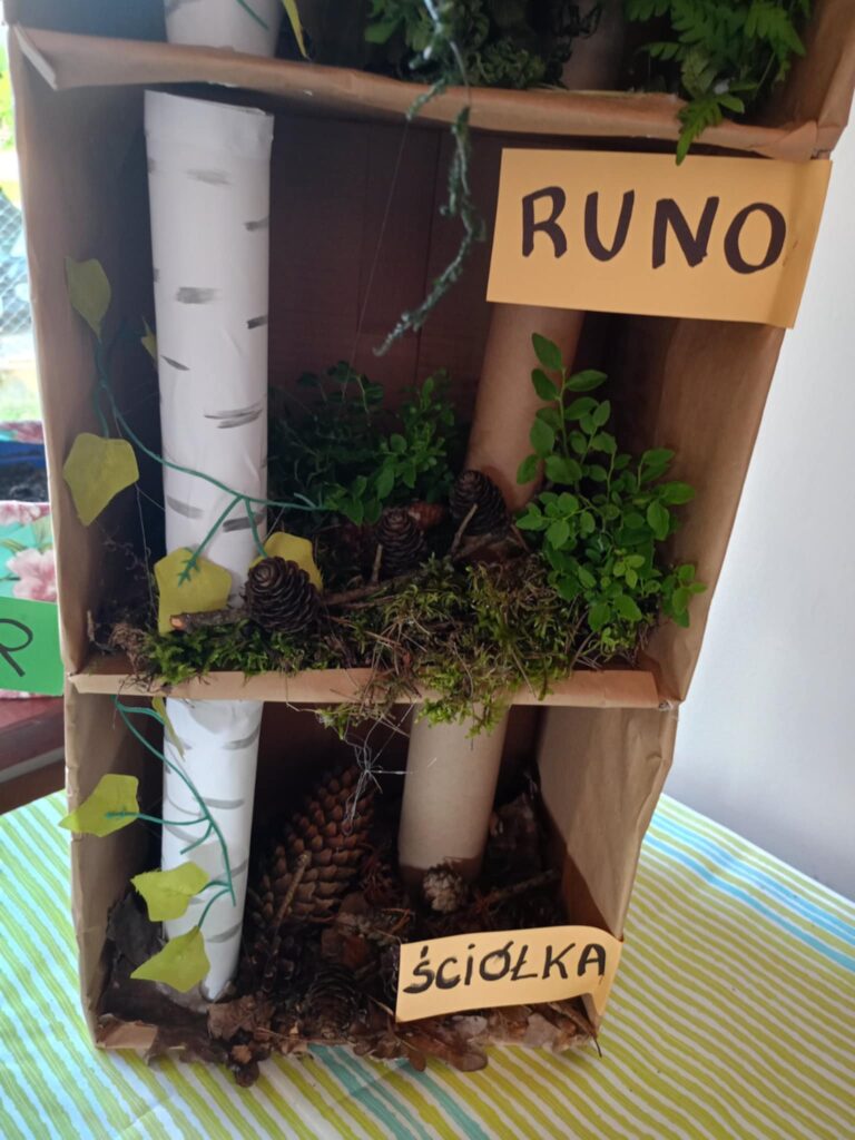 Z głowami pełnymi pomysłów zabraliśmy się do pracy. Wykorzystaliśmy materiały z recyklingu oraz skarby, które znaleźliśmy w lesie: szyszki, gałązki, liście, kawałki kory. Dzięki temu nasza miniaturowa wersja lasu jest nie tylko edukacyjna, ale też ekologiczna.