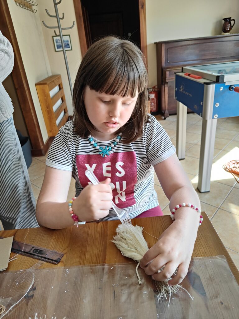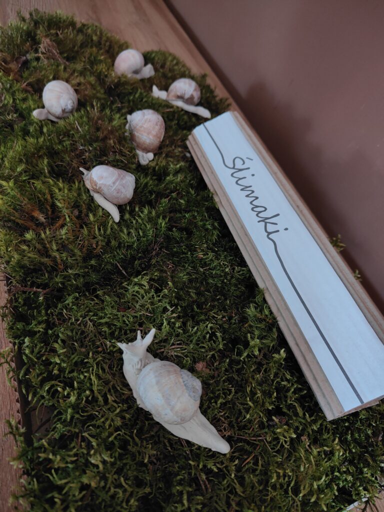Na zielonej „trawce” rozgościły się gliniane ślimaki, na blacie kolorowe skorupki – każdy inny, każdy wyjątkowy. Obok nich pojawiły się rysunki i drobne dekoracje, które dopełniły całości i stworzyły prawdziwie ślimakowy zakątek.